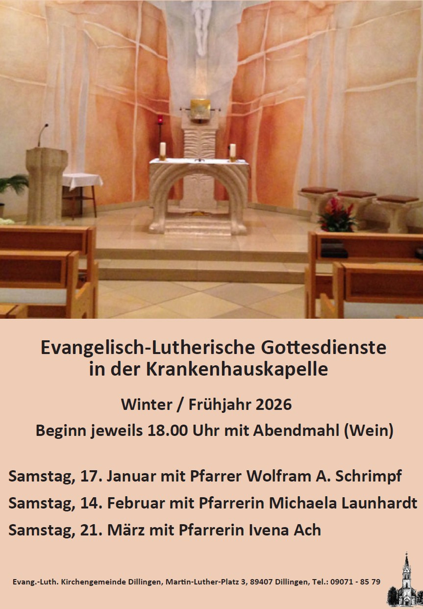 am Sonntagmorgen lange schlafen ... ausgiebig frühstücken ... ? Kein Problem, denn auch am Samstagabend gibt es einen Gottesdienst. Um 18:00 Uhr in der Krankenhauskapelle in Dillingen. Eingang gegenüber der Pforte.