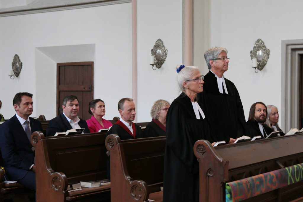 Foto von links: Dekan Jürgen Pommer, Norbert Bender vom Kirchenvorstand, Pfarrerin Gerhild Peiser, Pfarrer Christian Peiser, Landrat Markus Müller, Oberbürgermeister Frank Kunz